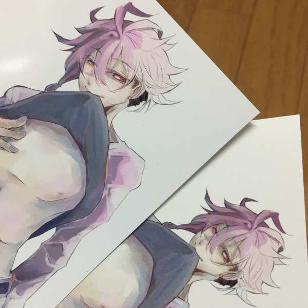 ついでに。たまにはに印刷したいと思って印刷して来たよ。下:711。上:ファミマ。711はポスカ。紙サラサラで地味で落ち着いた色になってくれた。色は近いかも。肌は軽く腐食しちゃったけど嫌いじゃない仕上がりに。ファミはポスカなかったので写真。だからテカテカのピンク強めに。全体的に明るい感じになった。血色良い。紫っていうかもう全てがピンクw写真わかりづらいケド髪とか蛍光ピンクになってるwww