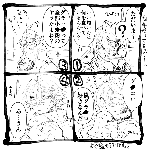平和なポッキーの日だなぁ。清麿ってたまにそういう時あったらカワイイ。頑張れ水君!負けるなってなってくる。あれ麿水なの水麿なの?関係ないけどイマジナリー大慶君ネタの時既に2人でポッキー食べてたね。にこり。