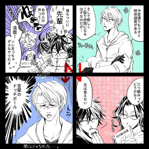 エヘヘへへへ。水麿の麿がどうしても麿水の麿っぽくなる。あと一線が越えられない光の戦士、水。ラクガキ楽しいなぁ。クソ四コマも描きたい。ユリ背景超綺麗だからソレもラクガキしたいんだよ。畑を耕したいんじゃー。あ、そうそう本日初めて刀ミュを体験したんだけど途中呼び出しで全部見れんかった。曽根さんの上でゴロゴロしてる安が可愛いかった。あと最近初期刀を皆極にしたんだけどハッチの株が凄い上がって、優しい子や。ホロリ。ってなってるので美しかったです。でもな、天保回想再度見てたからまた、ああああああっ2人とも可愛いよっおおおおて心が叫びあげてた結果が最近のラクガキで濃厚接触度が上がったせいです。それとテニスの時もそうだったケド、ミュ独特の突然歌うよ!は本当に慣れないなぁ。それがミュージカルといものなんだけど。そう言う事。