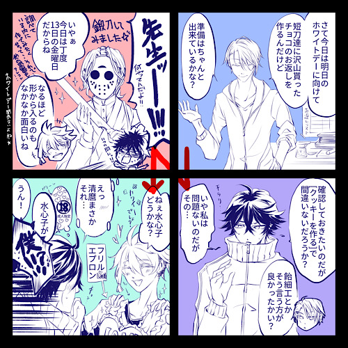 ハッピーホワイトデー!でもこの前パッケージにラクガキした例のチョコ食べてるよ!だいぶ慣れてきたからカラーやってみたんだけど麿色塗難しい。コレは課題だわ。iPad着色なんでPCで見たら色の違いに泡吹くかもな。でも楽しかったです。また描きたいなー。あとまた特命調査組漫画ポイポイ。ホワイトデーなのにホワイトデーの前日のネタだよ!ジェイソン自粛っての知って前日にいきなり描き始めたのにな。で、今まで気がつかなかったけど、チョギオだけずっと戦闘服だった真実。ごめんなチョギオ。しかし水麿スキーなのにいつも麿水っぽいのは何故だろう。麿水嫌いじゃ無いし好き。けど描きたいのは水麿で、なんででだろうね!本当ウチの可愛い麿知りませんか?状態ニャーン。